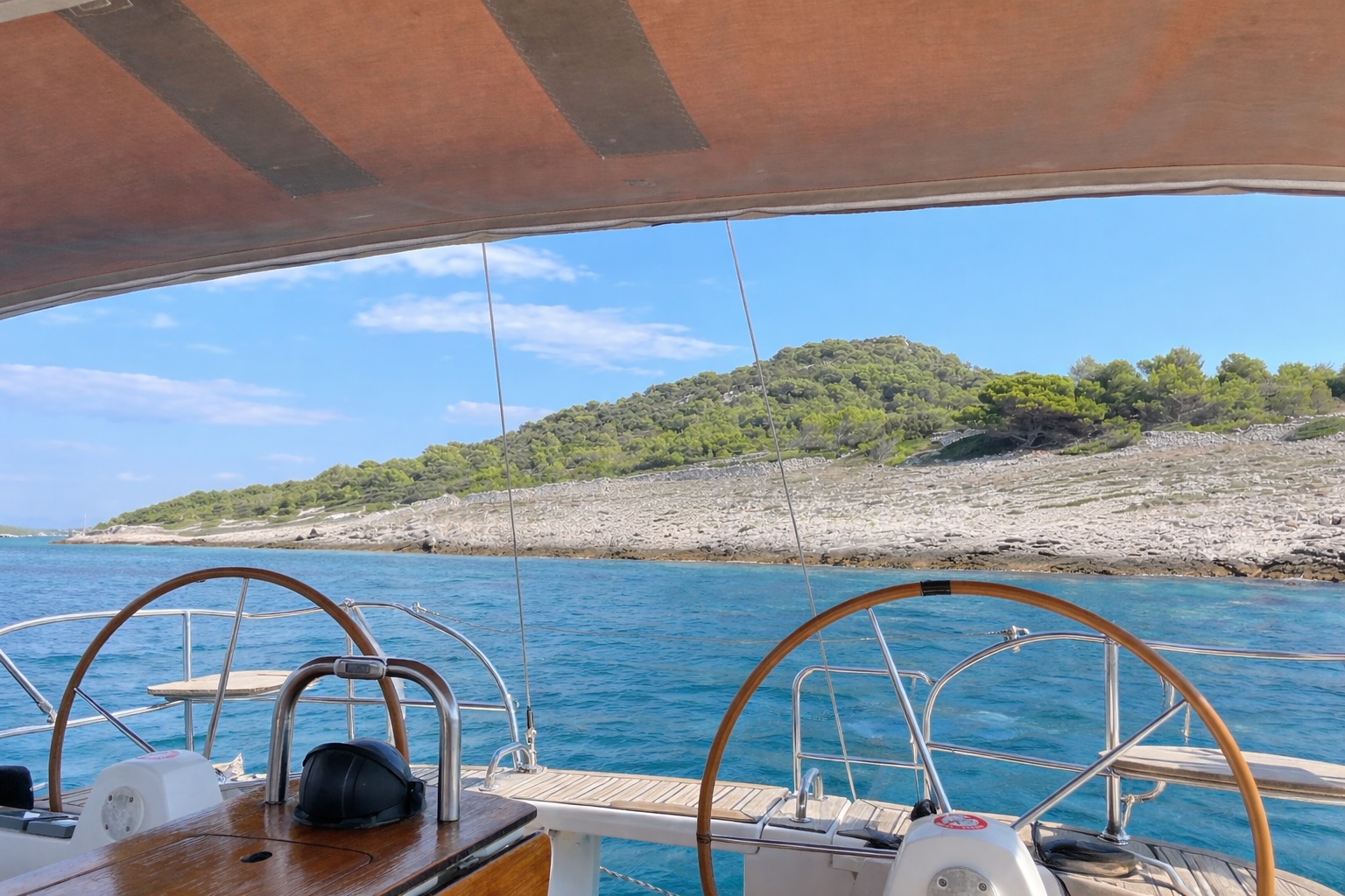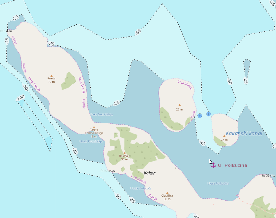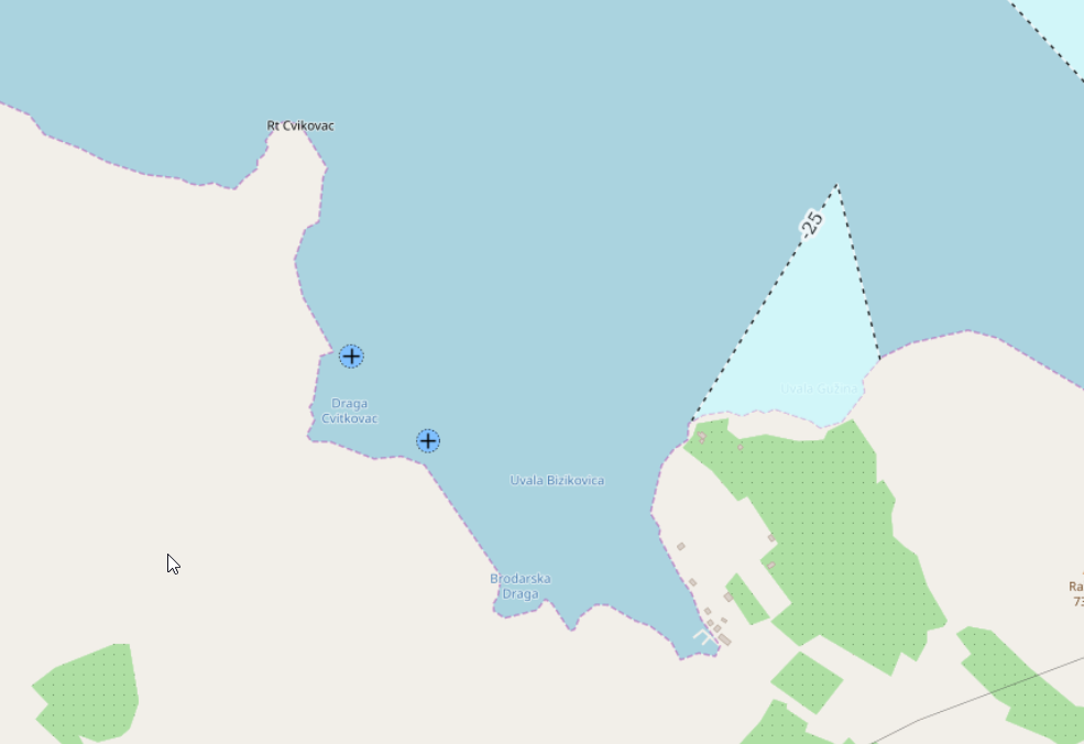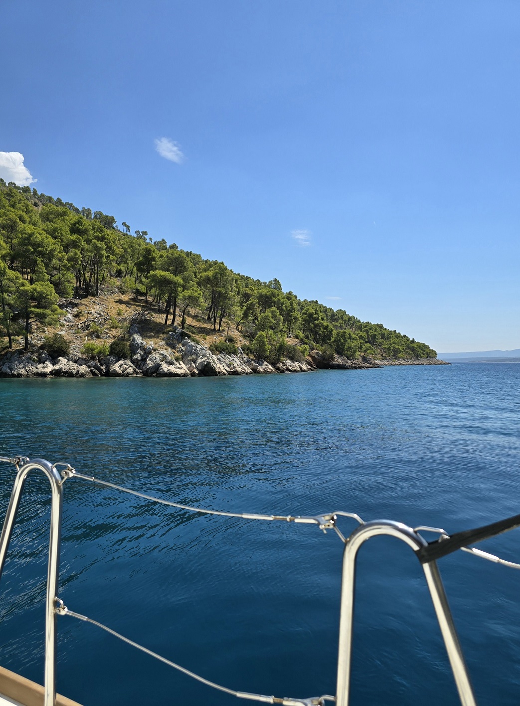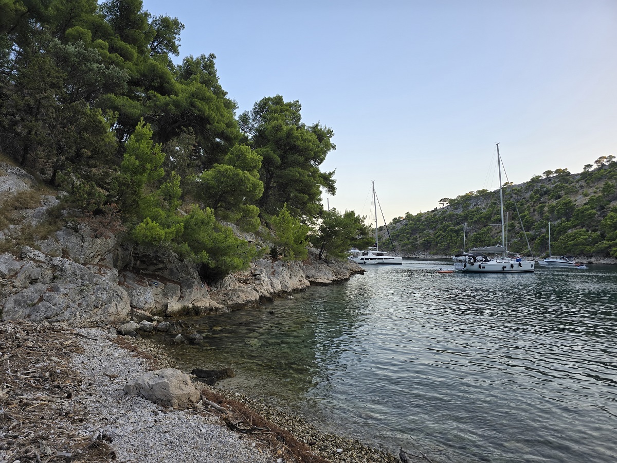 A small, rather technical bay just west of Sveti Juraj — less inviting at first glance, but ultimately the more workable option. After aborting our initial attempt in the neighbouring double bay, where rapidly shoaling rock near the shore made a stern line approach feel questionable, we relocated here to continue anchoring practice under more predictable conditions.