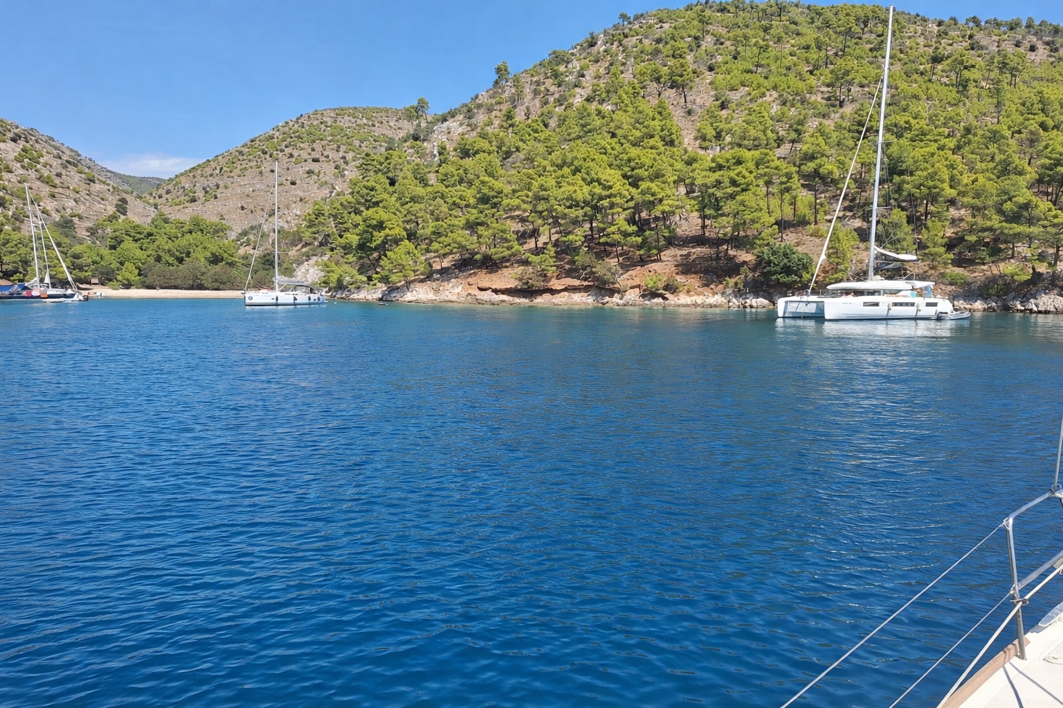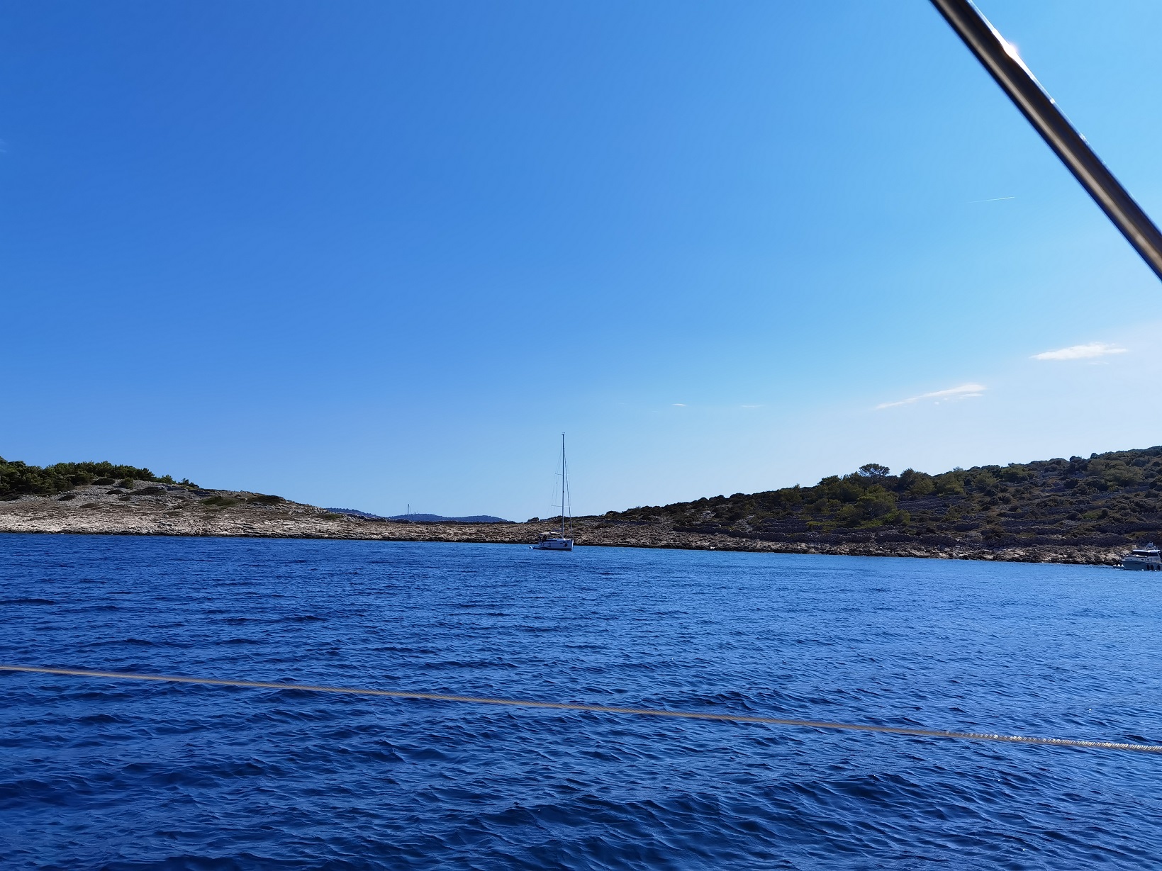In Uvala Melici, the anchor set immediately and held without issue. Plenty of room to swing, even with other boats around. The bay tolerates multiple setups — deeper draft yachts outside, shallower boats pushing further into side arms.