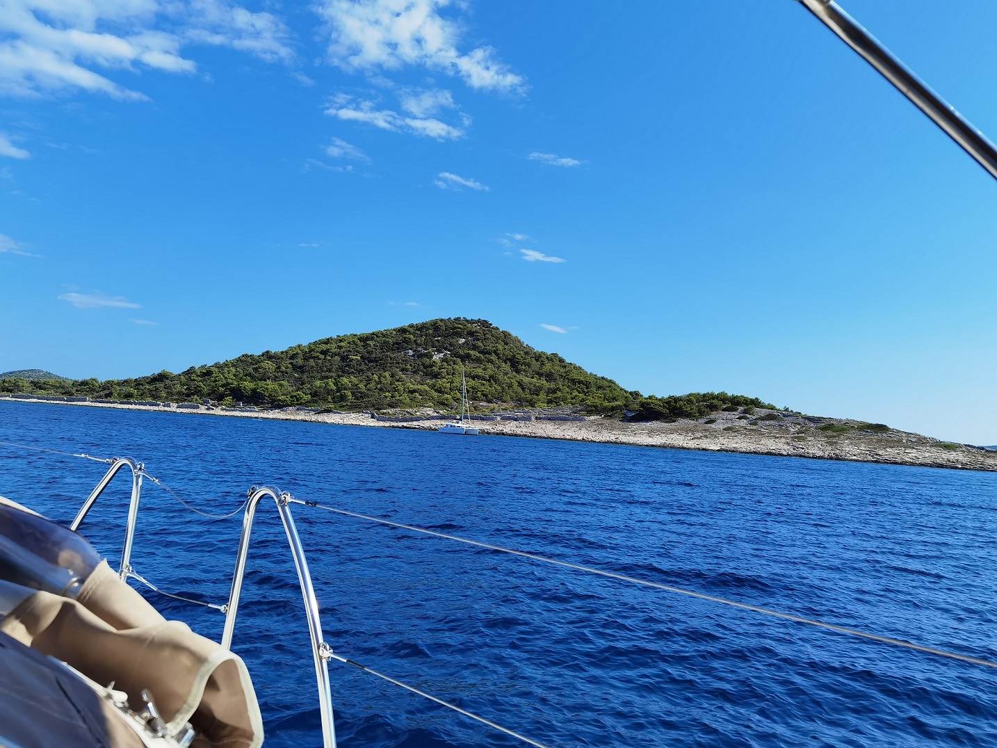 A functional but reliable refuge between Ilovik and Sveti Petar — more a place of purpose than romance. In strong bora conditions, the channel offered us a surprisingly calm and controlled environment, despite being open at both ends. In our case, what is usually a crowded mooring field turned into a quiet, almost solitary stop.